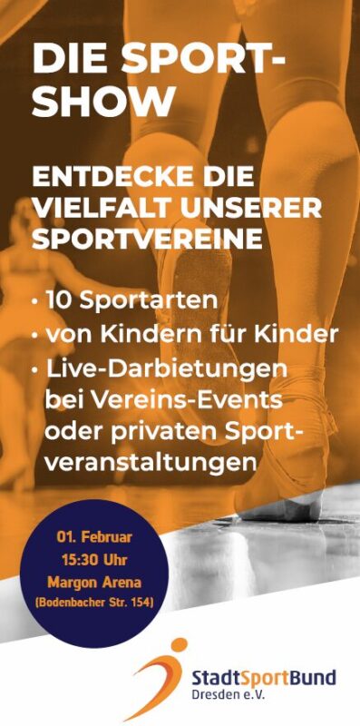 Wer die sportliche Vielfalt der Dresdner Sportlandschaft kennenlernen möchte, der sollte die Sport-Show des StadtSportBund Dresden e.V. (SSBD) nicht verpassen. Unter dem Motto “Tierische Märchen“ präsentieren am Sonntag, 01.02.2026 um 15.30 Uhr die jungen Athleten aus den Dresdner Sportvereinen ihr künstlerisch-musikalisches Show-Programm in der Margon Arena auf der Bodenbacher Straße 154.