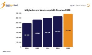 In den vergangenen vier Jahren ist die Mitgliederzahl im StadtSportBund Dresden um 27.844 Sportlerinnen und Sportler gestiegen. Die Entwicklung unterstreicht die große gesellschaftliche Bedeutung des Vereinssports in der Stadt und zeigt, wie wichtig die Arbeit der Dresdner Sportvereine für Bewegung, Gemeinschaft und Engagement ist.