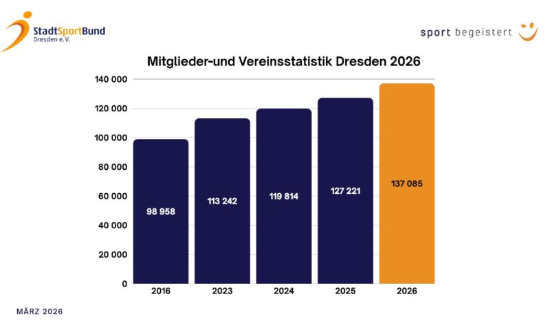 Der organisierte Sport in Dresden setzt seinen positiven Trend fort: Zum fünften Mal in Folge melden die Dresdner Sportvereine steigende Mitgliederzahlen. Laut aktueller Bestandserhebung des StadtSportBundes Dresden sind zum 1. Januar 2026 insgesamt 137.085 Sportlerinnen und Sportler in 398 Dresdner Sportvereinen aktiv. Gegenüber dem Vorjahr bedeutet das einen Zuwachs von 9.864 Mitgliedern (+7,2 %).